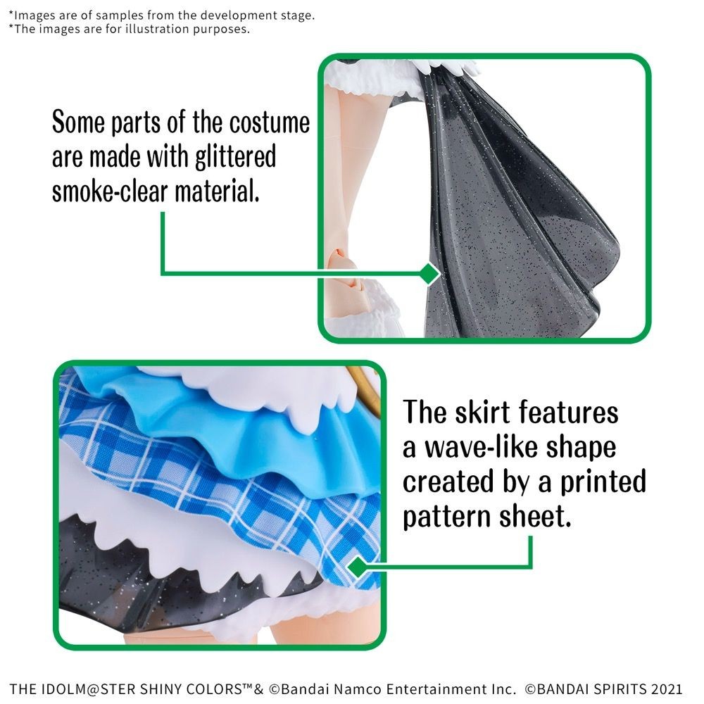 Il cuore sul petto è reso con una texture trasparente grazie a un adesivo plastico. La gonna presenta una forma ondulata, ottenuta utilizzando un foglio stampato con motivi decorativi. Alcuni componenti sono realizzati in materiale trasparente fumé con glitter.