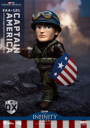 Celebrate the 80th anniversary of Marvel's legendary first Avenger: Captain America! It has been exactly 80 years since 1941's Captain America was released in comic book form to a rapturous welcome. Bringing patriotism to the masses when the world needed it the most during the second world war, Captain America came to epitomize all that was just, true and dignified. Steve Rogers became a generational aspiration, and now with the launch of the MCU and the Infinity Saga in the 21st century, a whole new generation has come to appreciate the awe inspiring strength of the captain! Beast Kingdom's EAA (Egg Attack Action) series of 6-inch, highly articulable action figures is launching the most patriotic figure of them all, the Infinity Saga Captain America DX Version collectible figure, bringing to life two of the captain's most recognizable outfits from the first film, Captain America: The First Avenger. Mounting a one man rescue, Steve Rogers dons a leather jacket to make his USO costume a little less conspicuous. Dubbed the 'Rescue Uniform' it is utilitarian as well as stylish. Using real material for the Jacket, and trousers, as well as a dedicated head sculpt with a helmet, Captain America is ready to go into battle. Not forgetting the metallic shield is also ready to protect with included bullet impact effects. Yet it was in the original outfit at the USO Show, where we saw Captain America don the star spangled banner costume that came to epitomize his look. The included head sculpt with side wings, as well as a full cloth costume shows off his stage presence as well as his strength. For fans of the very first Avenger, this is one deluxe set not to be missed. Accessories include: - EAA Special Edition Figure Body - War Rescue Uniform, with dedicated head sculpt - Star Spangled Banner uniform, with dedicated head sculp (Non-detachable design)t - Red gloves and boots - Three (3) pairs of replacement hands - Brown leather jacket - Dark green trousers - Three (3) pairs of replacement hands - A set of military design boots - One backpack - Classic metal shield, with bullet impact effects - Special, branded figure base with bracket temporarily sold out