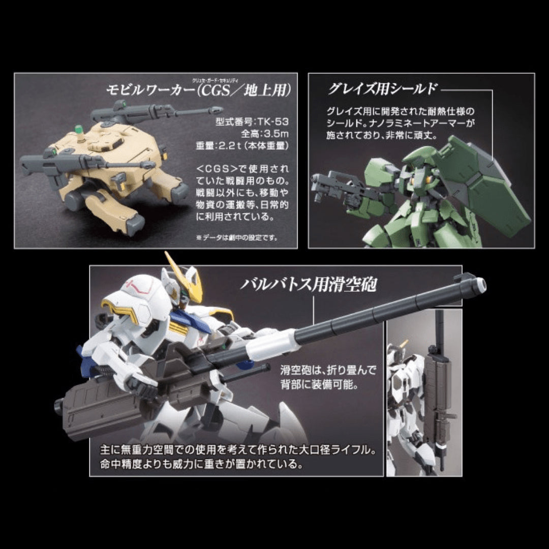 Il primo set aggiuntivo per la linea HG IBO è caratterizzato da un'intimidatoria serie di armi! L'Option Set 1 include un cannone di grosso calibro a lunga gittata, un'unità lancia, uno scudo e un'unità di supporto CGS Mobile Worker, in modo da poter rinforzare qualsiasi kit dei primi Iron-Blooded Orphans!