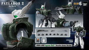 The latest addition to threezero's ROBO-DOU line based on Mobile Police Patlabor are the Ingram Reactive Armor Version figures from the animation movie "Patlabor 2: The Movie"! Unit 1, Unit 2, and Unit 3 respectively equipped with the Reactive Armor are being released at the same time. ROBO-DOU Ingram Unit 1 Reactive Armor Version collectible is a 1/35th scale (approximately 23cm tall) articulated figure with a remarkable zinc alloy die-cast main frame, providing nearly 50 points of articulation. The figure is constructed of ABS, PVC, POM, and fabric. Fabric is used to cover the arms and thighs, to replicate the Ingram silhouette and at the same time secure ariticulation capabilities. The iconic Reactive Armor jacket parts are made of PVC replicating its details. Threezero's notable weathering effects are added on the fabric and the Reactive Armor jacket parts to create an enhanced authenticity. The ROBO-DOU Ingram Unit 1 Reactive Armor Version includes many interactive features to increase playability. The right calf's side cover can be opened, and the hand revolver cannon can be stored inside the right calf. The right hand's wrist can be extended to reach for the stored revolver cannon. The front part of the reactive armor is detachable, and the cockpit hatch underneath can be opened. Pilot figure of Noa Izumi in the design of "Patlabor 2: The Movie" (non-articulated) can be seated inside the cockpit. The cockpit seat can be elevated to have the pilot's head to appear at the neck of Ingram, and the windshield can be opened up at the neck. Equipment includes a hand revolver cannon, stun stick in extended form, stun stick in retracted form, a riot gun, and a shield for left forearm (stun stick in retracted form can be stored inside). It also comes with interchangeable parts including a face piece with the faceguard up, a variety of hands in different poses, and a ROBO-DOU action stand. FEATURES: - 1/35th scale, approximately 23cm tall articulated figure - Materials used: ABS, PVC, POM, ZINC ALLOY (Joint covers uses fabric, and Reactive Armor jacket parts are made of PVC) - Fully articulated figure with nearly 50 points of articulation - Right calf's side cover can be opened (hand revolver cannon can be stored inside) - Right wrist extension function - Cockpit covers can be opened (after detaching the front part of the Reactive Armor jacket) - Cockpit seat can be elevated - Windshield can be opened at the neck ACCESSORIES - Hand revolver cannon - Stun stick (extended) - Stun stick (retracted) - Riot gun - Shield for left forearm (retracted stun stick can be stored inside) - Interchangeable face piece where the face guard is up - Interchangeable hand pieces (relaxed hands x 1 pair, opened hands x 1 pair, fists x 1 pair, right hand for holding hand revolver cannon, holding stun stick hand x 1 pair, right hand for holding riot gun) - Pilot figure (Noa Izumi) - ROBO-DOU action stand Materials: ABS, PVC, POM, die-cast zinc alloy, fabric product on pre-order with a fixed date (July 2025)