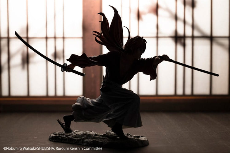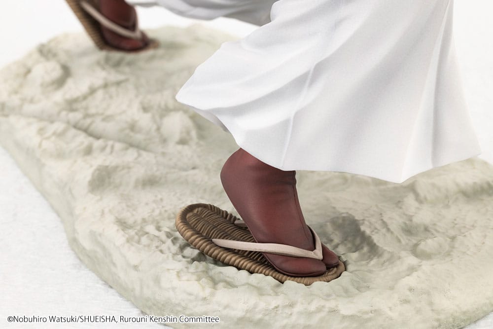 "Dall'anime Rurouni Kenshin, Kenshin Himura si unisce alla linea di figure in scala, completamente supervisionato dall'artista del manga Nobuhiro Watsuki in persona! Prende vita usando il suo Sakabato e il fodero per eseguire il doppio Battojutsu, Soryuusen. Sia i capelli che il kimono fluiscono con il suo agile movimento, conferendo un'atmosfera davvero dinamica a questo pezzo. Aggiungetelo oggi stesso alla vostra collezione insieme a Sanosuke Sagara e Hajime Saito".